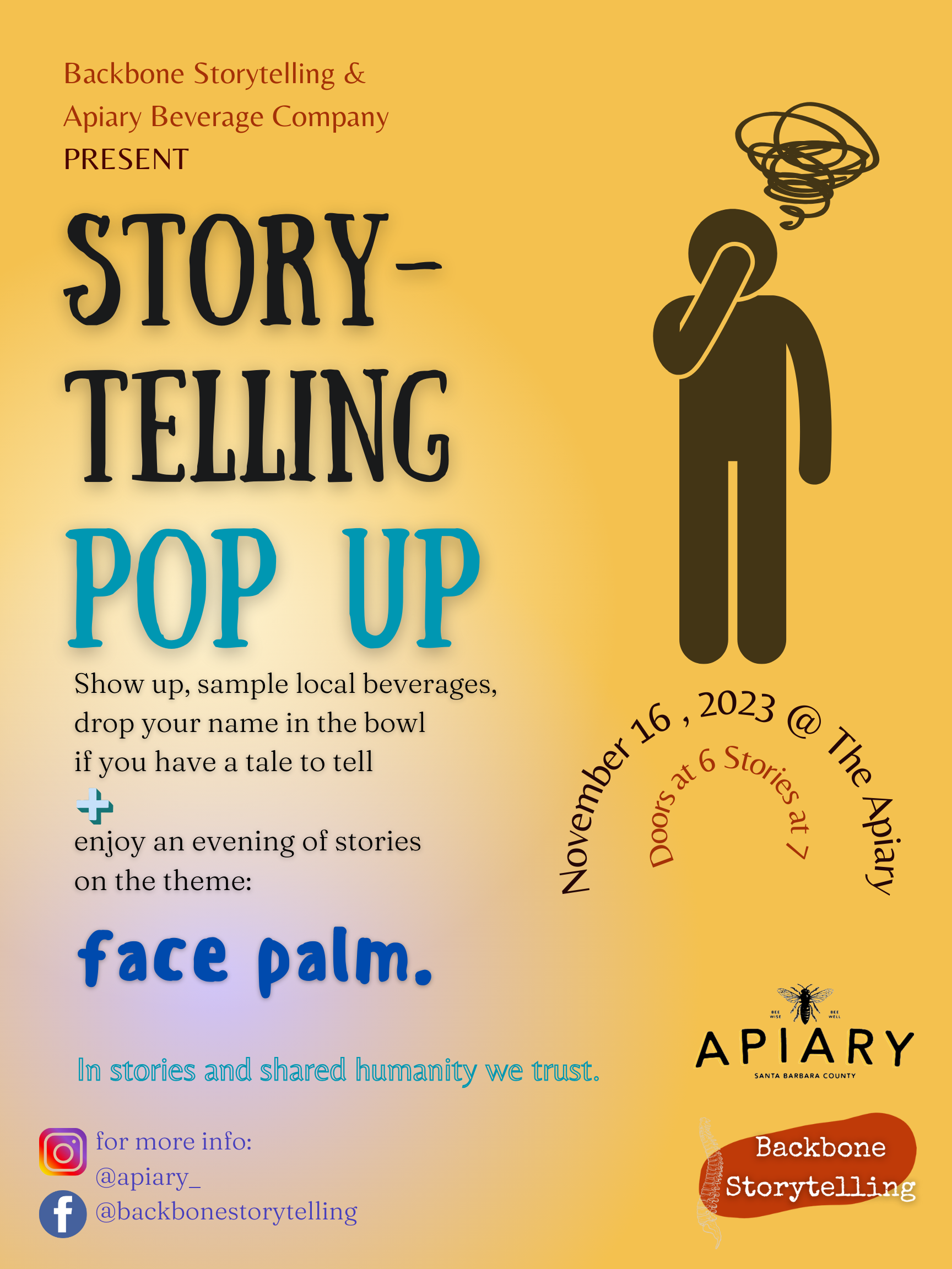 True stories told LIVE around a shared theme. Names drawn at random. Prepare to listen, share, laugh, cry, and go to the bones. Delivered via pop-up event.